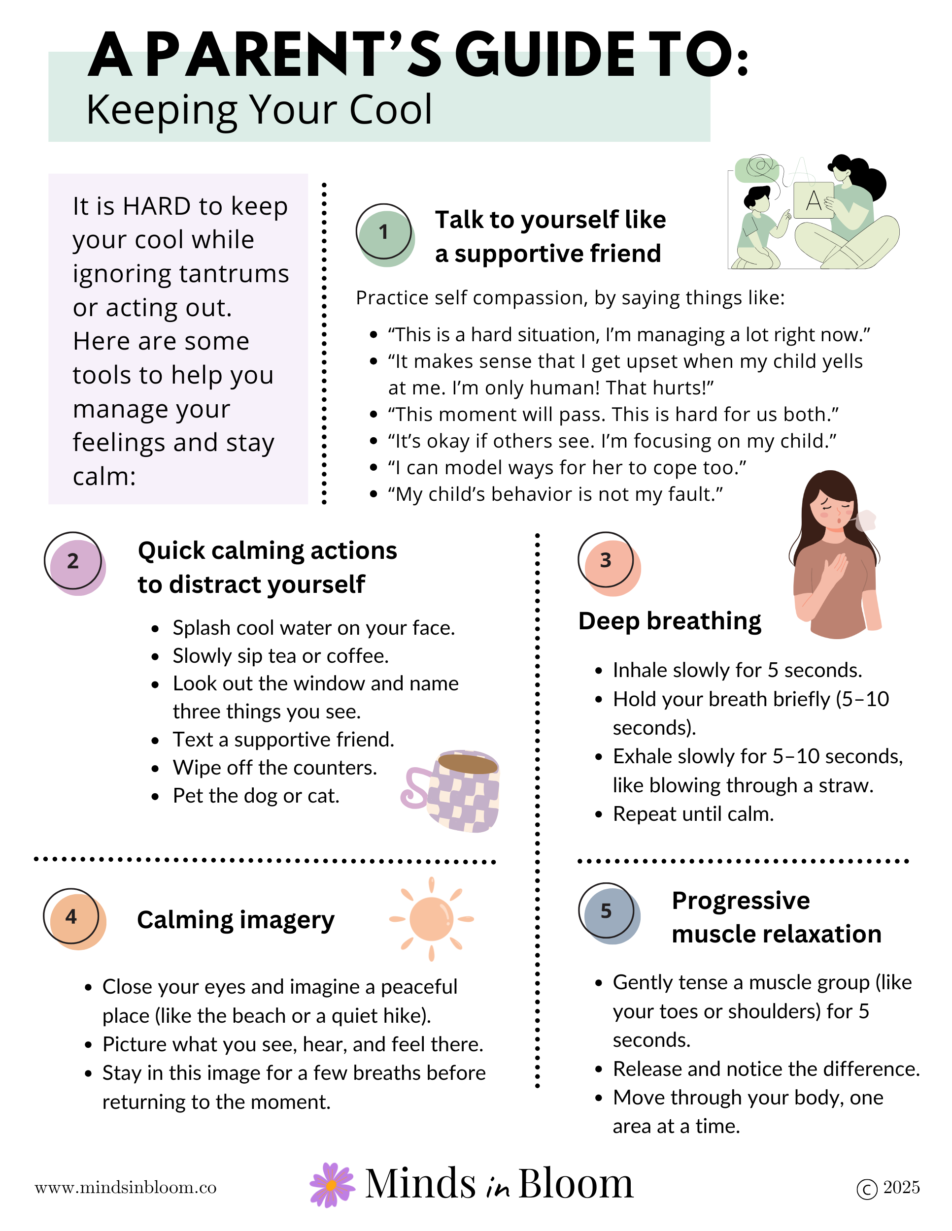 Reach for this guide when you feel your own frustration rising. Each tool is designed to help you reset and respond calmly, especially when your child is having big emotions or not listening to your requests. When you use these tools, you model for your child that even big feelings can be managed safely.