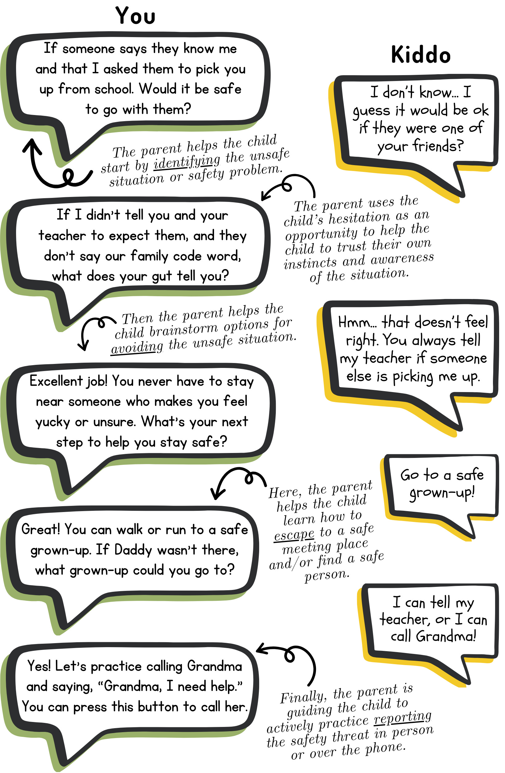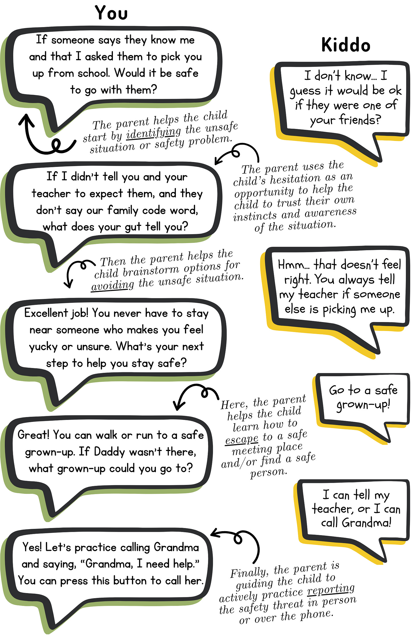 This discussion is just the beginning, and would need to be followed by rehearsing in real life, feedback, and regular practice of the skill. A great version of follow-up practice would be the parent taking the child to their school and standing in the pick-up zone and saying, âLetâs practice what you would do if a person you didnât know tries to pick you up at school. Iâll pretend to be that unknown personâŚâ