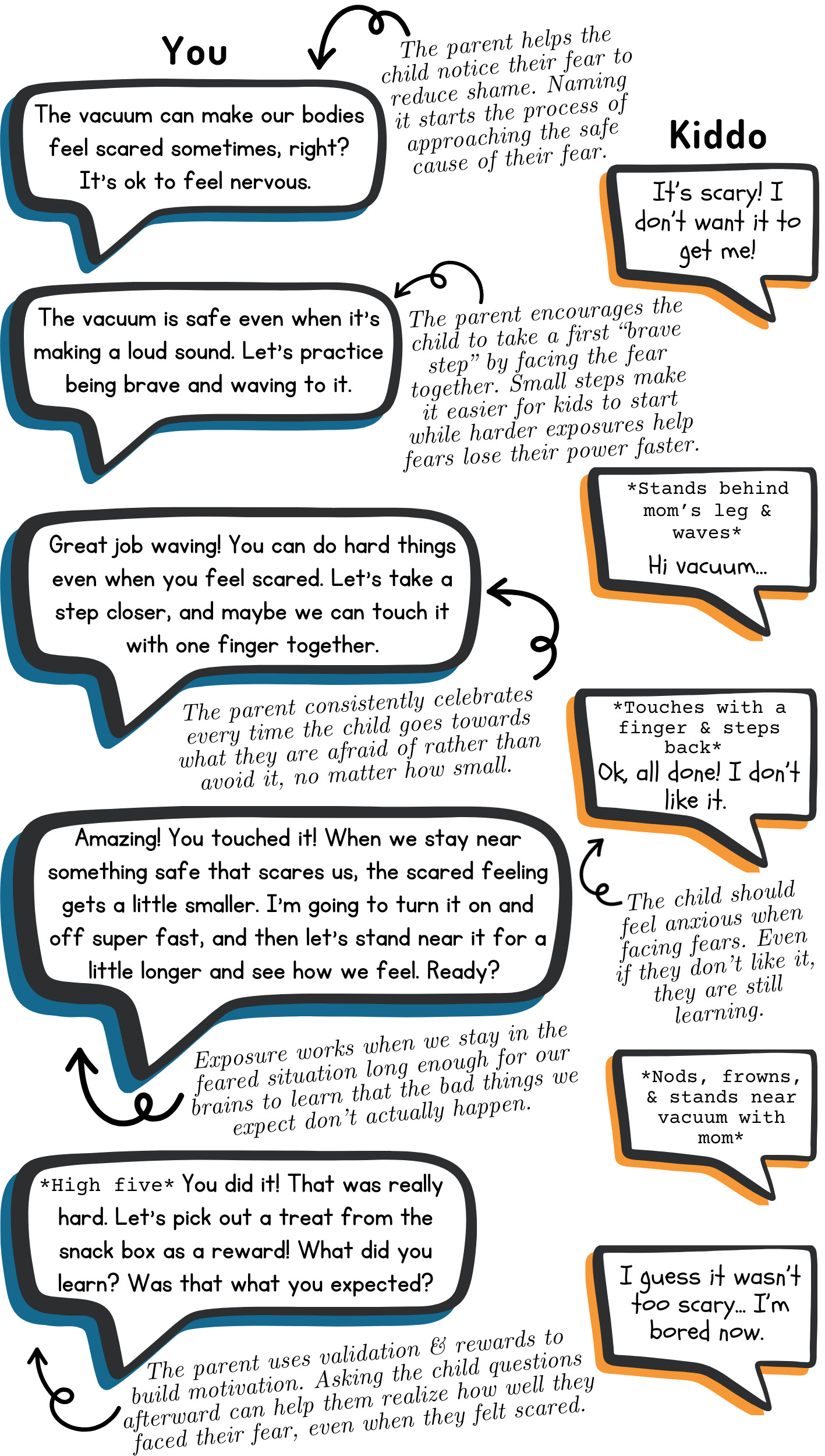 We want to make practicing exposure feel as approachable as possible. Here are some ideas of how you can talk to your child about fear and exposure. We’ve included some comments to help you understand why we recommend these steps.