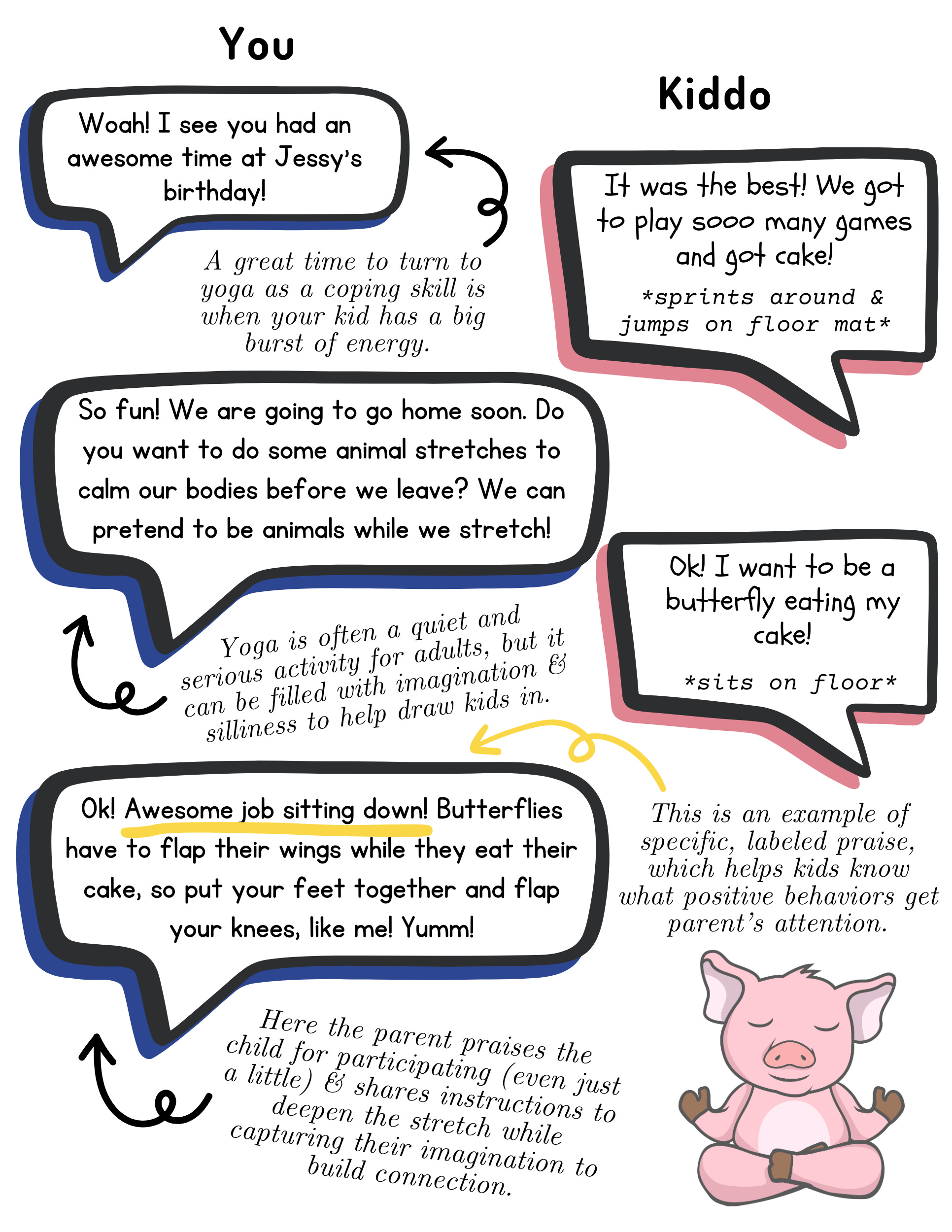 Each week, we recommend one kids book that teaches a mental health concept. Today, we’re sharing Peaceful Piggy Yoga written and illustrated by Kerry Lee MacLean. This book highlights the concept of self-regulation — the idea that practicing pausing our bodies can help build our capacity for attention and listening (which is great for parents 🙂). Read on to learn why we recommend Peaceful Piggy Yoga to the parents we know, the science behind self-regulation, and tips for talking to your kiddo about pausing our bodies.